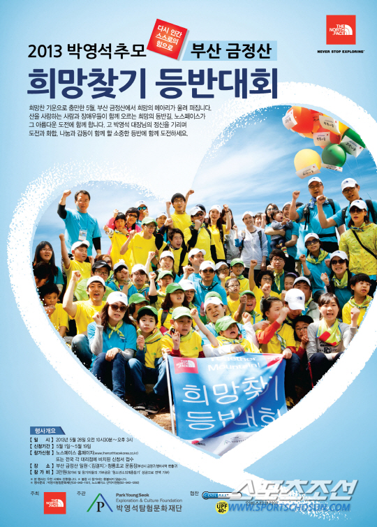 글로벌 아웃도어 브랜드 노스페이스는 오는 26일 부산 금정산 일원에서 개최하는 '2013 노스페이스 희망찾기 등반대회'의 참가자를 19일까지 모집한다.