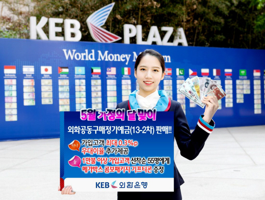 외환은행(은행장 윤용로/www.keb.co.kr)은 5월 가정의 달을 맞이하여 10일부터 6월 10일까지『외화공동구매정기예금(13-2차)』을 판매한다고 9일 밝혔다.