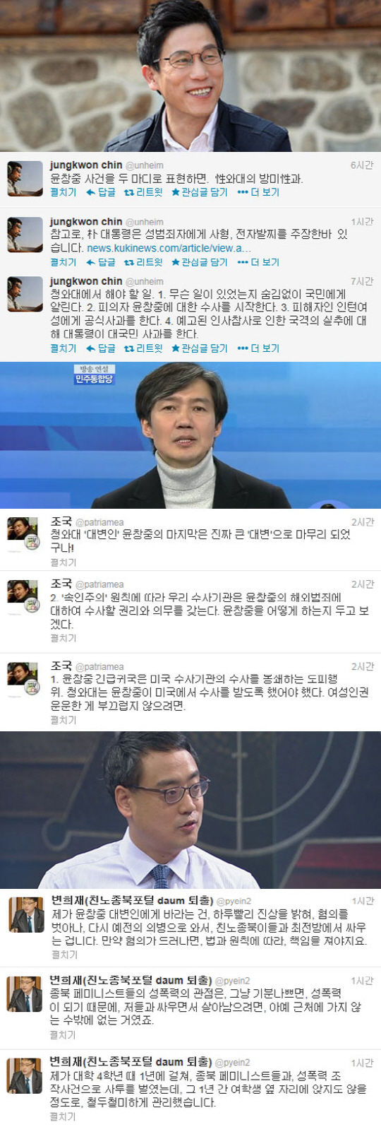 '보수 논객' 변희재 미디어워치 대표는 "제가 윤창중 대변인에게 바라는 건 하루 빨리 진상을 밝혀 혐의를 벗어나 다시 예전의 의병으로 와서 친노종북이들과 최전방에서 싸우는 겁니다"라며 "만약 혐의가 드러나면 법과 원칙에 따라 책임을 져야지요"라는 글을 남겼다.