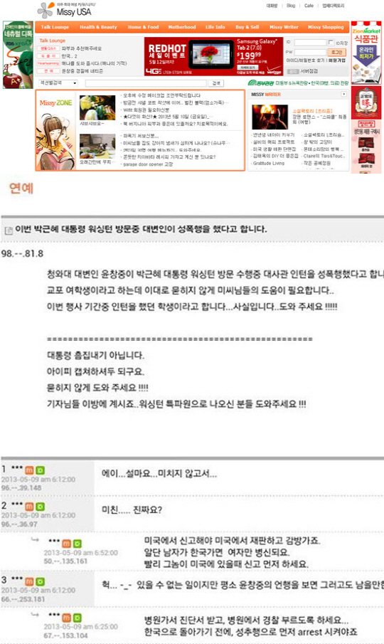 9일(현지시간) 미시USA의 게시판에 "이번 박근혜 대통령 워싱턴 방문중 대변인이 성폭행을 했다고 합니다"라는 제목의 글이 게재됐다.