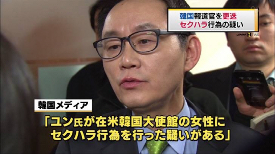 윤 전 대변인은 9일(현지 시간) 워싱턴 DC 백악관 인근의 호텔에서 한 여성을 성추행했다는 의혹을 받고 있으며. 피해 여성은 대사관 인턴으로 일하는 23세 미국 시민권자로, 이번 박근혜 대통령의 미국 방문 행사를 위해 채용됐던 것으로 알려졌다. 대통령의 방미 일정 중 대변인이 성추행 사건으로 경질된 것은 전례가 없던 일이다. 외신보도가 이어지고 있어 국제적 망신을 피할 수 없을 것으로 보인다.