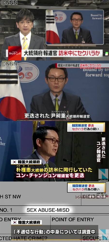 특히 일본의 니혼테레비 뉴스프로그램 NNN과 TBS 도쿄방송 뉴스 네트워크 JNN은 공중파 뉴스를 통해 "윤 전 대변인이 방미 중 성희롱으로 경질됐다"고 보도했다. 이와 함께 미국 워싱턴DC 경찰 당국에 정식 접수된 윤 전 대변인에 대한 성범죄 신고서까지 공개했다.