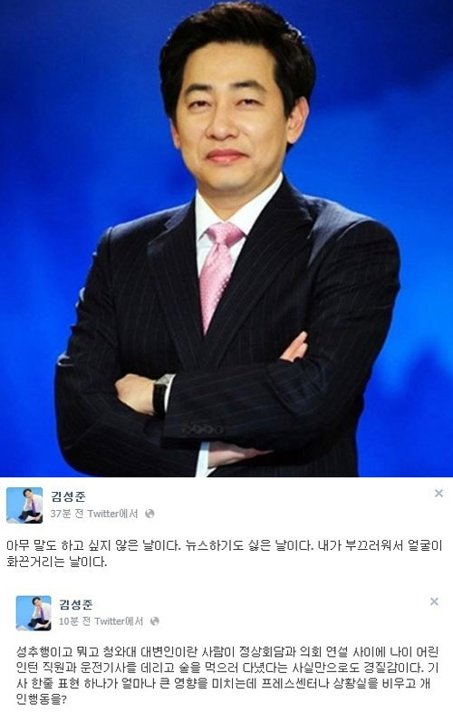 김성준 SBS 8시 뉴스 앵커가 윤창중 전 청와대 대변인의 성추문 의혹과 관련해 트위터에 남긴 글이 네티즌들의 관심을 모으고 있다.