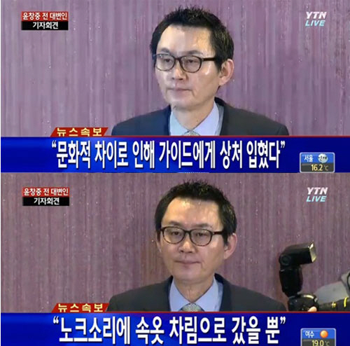 또한 윤 전 대변인은 호텔 방으로 여성 인턴을 불렀다는 의혹에 대해서는 "가이드가 다음날 아침 내 방을 노크해 긴급 브리핑 자료인가 하는 생각에 속옷차림으로 황급히 문 쪽으로 뛰어갔다. 그런데 가이드가 있었고, 그래서 '여기 왜왔어, 빨리가'하고 문을 닫은 것일 뿐"이라고 설명하며 "제가 있을 때 제 방에 그 가이드가 들어온 적이 없다. 여자 가이드를 방으로 불렀다는 보도는 사실무근이다. CCTV로 확인하면 될 일이다"이라고 부인했다.