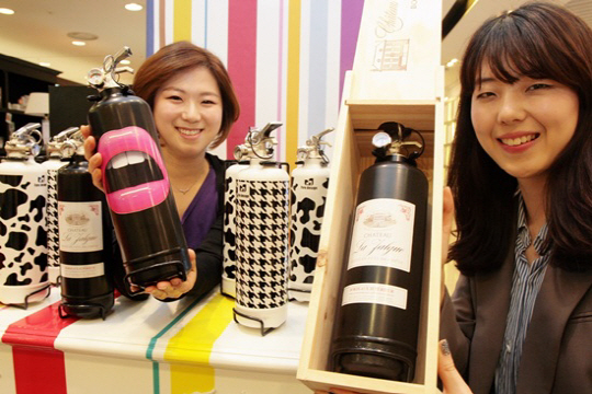 갤러리아명품관에서는 프랑스 파이어디자인에서 제작한 와인병 모양의 소화기를 비롯하여, 기발하고 재치있게 디자인된 소화기들을 선보여 고객들의 이목을 끌고 있다.