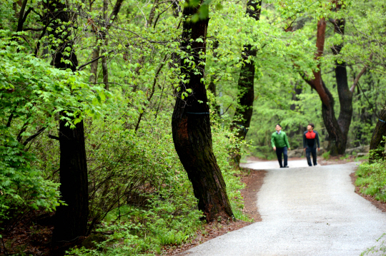 능선 따라 걷는 길은 툭 트인 전망으로 먼 산, 옆 능선의 풍광이 파노라마처럼 펼쳐지는데, 신록이 푸름을 더해가는 산자락은 초록과 파스텔톤의 연두 색채가 멋진 풍경을 그려낸다. 코스 곳곳에 다리 쉼터도 마련해 둬 호젓한 산행 길에 여유를 찾을 수 있도록 했다.