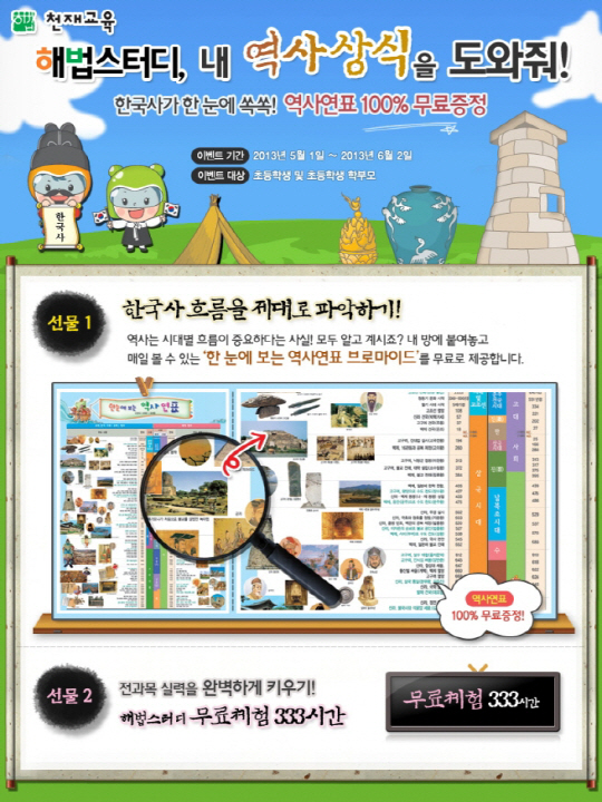 천재교육의 초등 온라인 학습 사이트 '해법스터디(www.hbstudy.co.kr)'에서 5월 가정의 달을 맞아 한국사를 알아볼 수 있는 '역사연표 브로마이드'를 무료로 증정하는 이벤트를 실시한다고 밝혔다.
