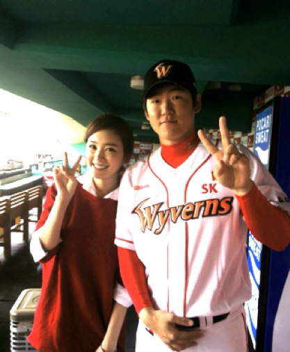 | 공서영 아나운서(좌)가 박희수 SK와이번스 선수가 포즈를 취하고 있다. |