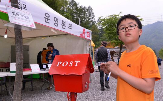'진실캠프'에서 한 어린이 참가자가 진실편지함에 가족에게 보내는 편지를 넣고 있다. 가평=김경민 기자 kyungmin@sportschosun.com