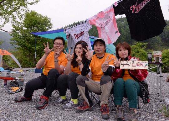 '캠핑오려고 야구장 응원도 취소했어요''진실캠프'에서 LG야구팬들이 포즈를 취하고 있다. 가평=김경민 기자