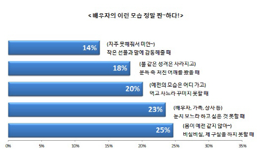 또한 <배우자의 이런 모습 정말 짠하다!>라는 문항에서는 건강이 예전 같지 않지 않게 '비실비실, 제 구실을 하지 못할 때'(25%)가 1위를 차지했다. 이어, 가족이나 상사 등의 '눈치 보느라 하고 싶은 것 못할 때'(23%), 예전 모습과는 달리 '먹고 사느라 꾸미지 못할 때'(20%), 불 같은 성격은 사라지고 '문득 축 처진 어깨를 봤을 때'(18%), '작은 선물과 말에 감동해줄 때'(14%) 순으로 나타났다.