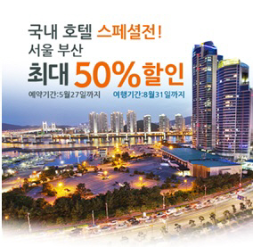익스피디아(www.expedia.co.kr)가 5월 21일부터 5월 27일까지 일주일 동안 서울 및 부산의 주요 호텔 상품을 최대 50% 할인된 가격에 제공하는 특가 프로모션을 진행한다.