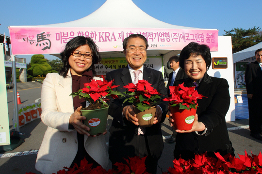 ◇말산업은 고용창출을 할 수 있는 사회적 기업 법인 설립, 정서장애 청소년들을 치유할 수 있는 승마 힐링, 말브랜드 등 다양한 분야로 확대되고 있다. 장태평 마사회 회장이 마분퇴비로 만든 '크리스마스 꽃' 포인세티아를 들어 보이고 있다. 왼쪽부터 마사회가 설립한 사회적 기업 에코그린팜 백혜숙 대표, 장 회장, 전혜숙 전 국회의원.