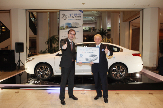 르노삼성자동차(대표이사 프랑수아 프로보)이 20일 그랜드 힐튼 서울(서울시 서대문구 홍은동 소재)에서 그랜드 힐튼 서울 25주년 기념 럭키 드로우 이벤트를 실시하고 1등 행운의 주인공에게 SM7 최상위 모델을 전달했다.
