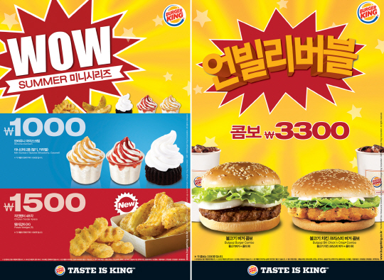 점점 더워지는 날씨에 맞춰 선보이는 'WOW 썸머 미니시리즈'는 버거킹 아이스크림 3종인 미니선데 2종(캬라멜, 딸기)과 부드러운 소프트아이스크림이 올려진 달콤한 브라우니 아이스크림을 각각 1,000원, 치킨 텐더 4조각과 웨지감자(R)를 각각 1,500원에 판매한다. 특히 기존 킹박스에만 제공됐던 웨지감자를 부담없는 가격으로 만날 수 있게 되었다.