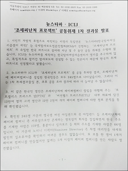 한편 '뉴스타파'측은 "조세피난처에 페이퍼 컴퍼니를 설립한 사회지도층 인사들의 정보를 공개하는 것이 알권리와 공공의 이익에 부합하는 것으로 판단해 철저한 확인 작업을 거쳐 매주 한 두 차례 순차적으로 명단을 공개할 예정이다"라고 공고했다.