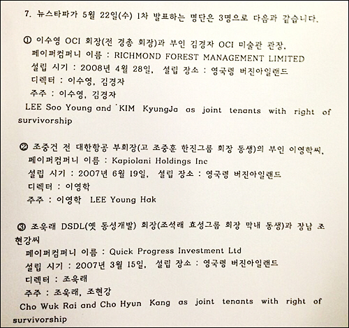 22일 '뉴스타파'측은 "조세피난처에는 이수영 OCI회장, 조중건 전 대한항공 부회장, 조욱래 DSL 회장과 그 장남 조현강씨 등을 포함한 한국인들은 모두 245명으로 나타났다"며 "이름만 대면 알만한 재벌 총수와 총수 일가 등 사회 지도층 인사들이 상당수 포함돼 있다"고 발표해 파장을 몰고 왔다.