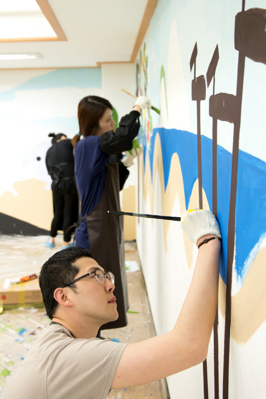 벽화 그리기 봉사활동은 임직원 재능 나눔의 일환으로, 미술 동호회 및 디자인에 재능이 있는 직원들을 중심으로 진행됐다. 임직원들은 벽화 도안작업부터 직접 참여하는 것은 물론, 당일 밑그림 그리기, 채색, 마무리 작업까지 약 7시간 동안 봉사활동을 진행했다.