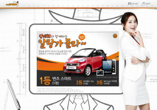 새로운 자산관리 서비스인 '미스터 스마트'에서 진행하는 온라인 이벤트는 총 3가지가 동시에 진행된다. 먼저 한화투자증권 '미스터 스마트'의 모델인 배우 김태희와 함께하는 '알랑가몰라~' 이벤트는 미스터 스마트 사이트(ww.mrsmart.co.kr)를 방문하여 김태희가 소개하는 미스터 스마트의 자산관리 체험 영상에 참여하면 확인할 수 있는 퀴즈 이벤트로 벤츠, 아이패드, 미스터 스마트 이어캡 등을 111명에게 선물로 증정한다.