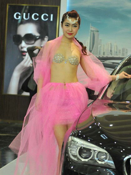 21일 중국 후난성에서 열린 BMW 7시리즈 모터쇼에 다이아몬드 브래지어 차림의 모델이 등장해 눈길을 끌었다.