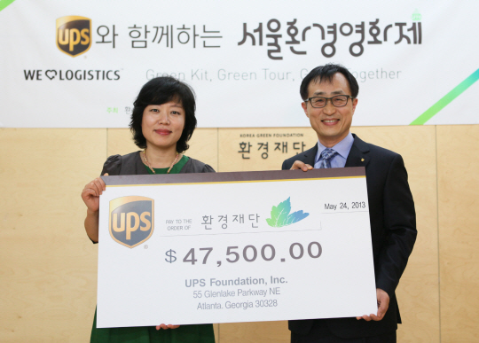 특송 및 공급망 서비스 기업 UPS코리아(www.ups.co.kr)는 24일 서울 중구 소재 레이첼카슨홀에서 'UPS 그린캠페인' 기금 4만7500달러(한화 약 5300만원)을 환경재단(http://www.greenfund.org)에 전달했다.
