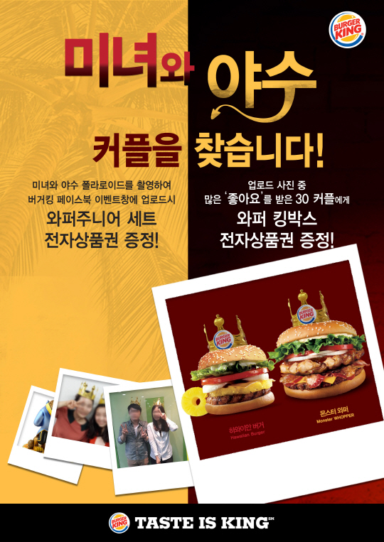 업로드한 사진 중 가장 많은 '좋아요'를 받은 30커플을 선정하여 와퍼 킹박스 전자상품권을 발송한다. '미녀와 야수' 커플은 연인, 친구, 가족 등 나이와 성별 구별 없이 2인이면 누구나 해당된다. 단, 사진에는 버거킹 왕관 소품이 함께 찍혀 있어야 한다.