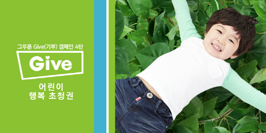 Give(기부) 캠페인은 일정 명수가 모이면 딜 거래가 성사되는 소셜커머스 비즈니스 모델에서 착안, 그루폰 고객들의 착한 소비가 모아지면 특별한 혜택이 특정 대상에게 선사되는 그루폰 공식 사회공헌활동이다.