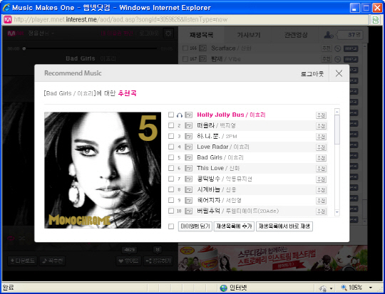 일례로 이효리의 'Bad Girls'에 대한 추천곡은 2PM의 '하.니.뿐', 백지영의 '떠올라', 서인영의 '헤어지자' 등이 있다. 로이킴의 '봄봄봄'에 대한 추천곡으로는 홍대광의 '굿바이', 악동뮤지션의 '외국인의 고백', 다비치의 '거북이', 백지영의 '봄비' 등을 추천한다.