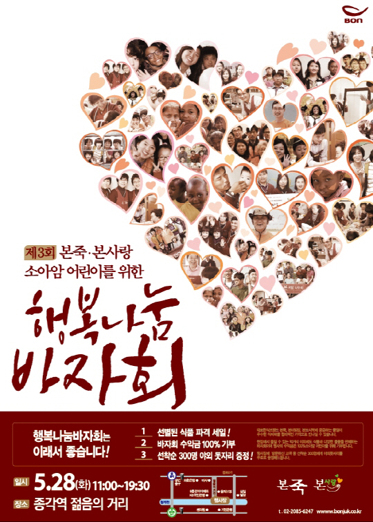 웰빙죽 전문점 '본죽'(대표 김철호, www.bonif.co.kr)은 5월 가정의 달을 맞아 28일(화) 서울 종각역 젊음의 거리에서 소아암 어린이를 위한 행복 나눔 바자회를 개최한다고 밝혔다.
