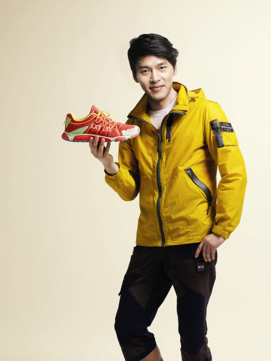 | K2의 신개념 워킹화 알파를 현빈이 들고 포즈를 취하고 있다. |