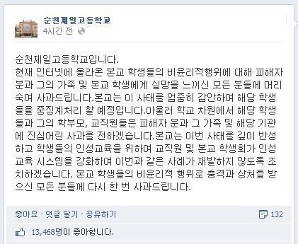 순천제일고등학교는 28일 공식 페이스북에 "본교 학생들의 비윤리적 행위에 대해 피해자분과 그의 가족 및 본교 학생에게 실망을 느끼신 모든 분들께 머리 숙여 사과드립니다"라며 공식적으로 사과했다.