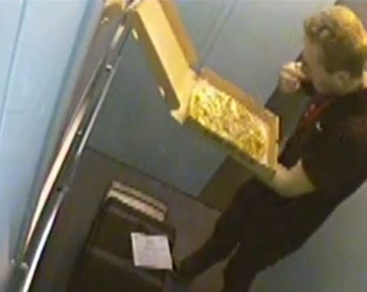 피자 배달맨이 고객에게 배달되던 피자의 토핑을 몰래 먹는 장면이 엘리베이터 CCTV에 잡혔다.