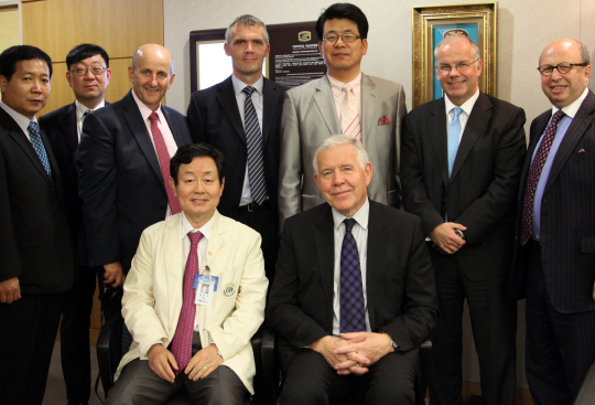 ◇옥스포드 대학병원 이사장 조나단 마이클 경(아래 오른쪽)을 비롯한 관계자들이 선진의료시스템과 첨단시설을 보기위해 서울성모병원을 방문하고 황태곤 병원장(아래 왼쪽)과 함께 기념사진을 찍었다.