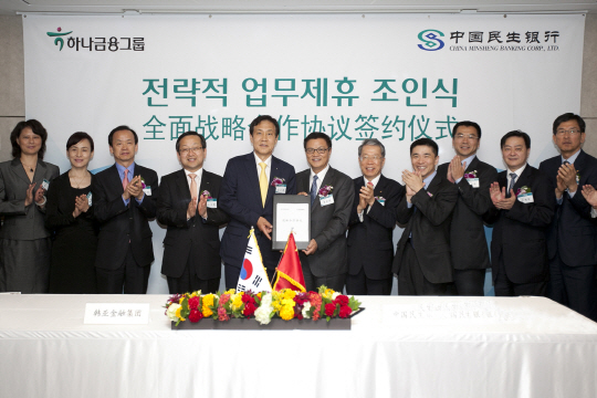 하나금융그룹(회장 김정태 www.hanafn.com)은 중국 민생은행과 29일 오후 서울 롯데호텔에서 하나금융그룹 김정태 회장, 동문표 민생은행 동사장, 하나은행 김종준 행장 및 외환은행 윤용로 행장 등이 참석한 가운데 전략적 업무제휴 협약을 체결했다고 밝혔다.