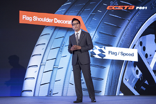 2013 금호타이어 신제품 설명회에서 박세창 영업총괄부사장이 신제품 '엑스타 PS91'에 대해 프리젠테이션을 하고 있다.