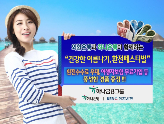 하나금융그룹(회장 김정태, www.hanafn.com)은 3일 하나은행(은행장 김종준)과 외환은행(은행장 윤용로)이 공동으로 여름철 환전고객을 대상으로 환율우대, 여행자보험 무료가입, 추첨을 통한 다양한 경품 증정 등 푸짐한 혜택을 제공하는 '건강한 여름나기, 환전페스티벌'을 8월말까지 실시한다고 밝혔다.