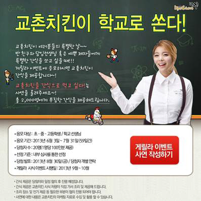 모집 응모는 6월 3일부터 7월 31일까지 총 59일간 진행하며, 오는 8월 30일 개별 공지를 통해 당첨자 선발한다. 이벤트 참가 희망자는 학교 친구와 담임선생님 혹은 제자들이 함께 교촌치킨을 꼭 먹어야 되는 특별한 사연을 교촌치킨 홈페이지에 작성해 응모하면 된다.