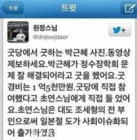 | 원정스님 체포, 박근혜 억대 굿판 초연스님에게 직접 들었다 주장 |