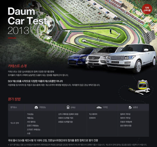 다음은 '카테스트(http://auto.daum.net/cartest/index.daum)' 첫 순서로 많은 이용자들의 관심을 모으고 있는 SUV(스포츠유틸리티차량)에 대한 테스트를 실시했다. 이를 위해 국내에 출시된 SUV를 제조사별 1대씩 총 11대 선정했으며, 자동차 전문가들로 구성된 심사위원단이 인제 스피디움 트랙에 모여 동일한 조건에서 테스트를 진행했다.