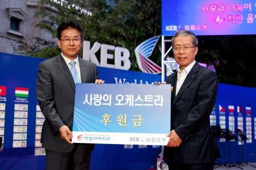 | ◇서울 을지로 소재 외환은행 KEB Plaza(본점 야외 광장)에서 4일 열린 '사랑과 나눔이 있는 착한 음악회' 'KEB 앙상블 음악회'에 참석한 윤용로 외환은행장(오른쪽)이 행사 당일 외환은행 임직원, 시민, 관광객이 공동 모금한 기부금을 '사랑의 오케스트라' 남동우 관장에게 전달했다. |