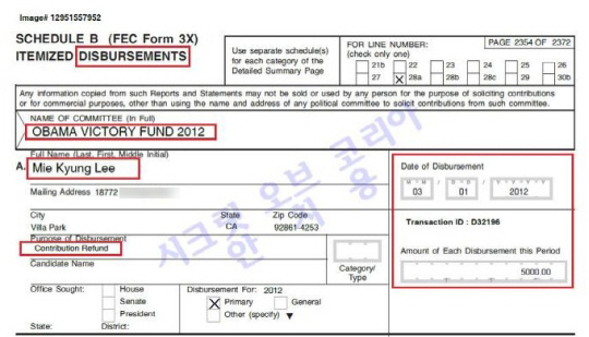 아울러 이 부회장의 정치자금 헌금액 7만1600달러는 개인금 기부금 순위에서 전체 1000위권내에 들어가는 고액헌금으로 확인됐다.