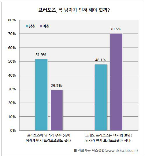 남성들의 경우 '여자가 먼저 프러포즈해도 좋다'는 의견과 '남자가 프러포즈해야 한다'는 의견이 51.9%, 48.1%로 팽팽히 맞선 가운데, 여성들의 경우는 '남자가 먼저 프러포즈 해야 한다'는 의견이 70.5%로 2배 이상 많았다.