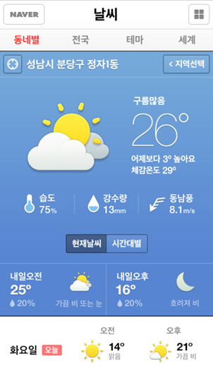날씨 상태를 더욱 손쉽게 확인할 수 있도록날씨 정보 이미지를 단순 날씨 상태 뿐 아니라, 상태의 정도까지 확인할 수 있도록 보다 세분화하고, 상태에 따라 서비스 배경색도 구분해 제공한다. 예를 들어, 비오는 날이면, 현재 강수량에 따라 그 정도를 가늠할 수 있는 차별화된날씨 상태 이미지가 제공된다.