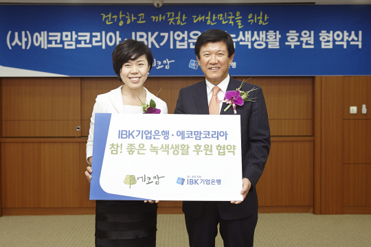 에코맘코리아는 환경부 지정 녹색 교육기관으로, 기업은행은 이번 협약을 통해 에코맘코리아가 추진하는 각종 시민캠페인과 대국민 교육 프로그램 등에 적극 동참한다. 조준희 기업은행장(오른쪽)과 하지원 에코맘코리아 대표가 협약식에서 포즈를 취하고 있다.