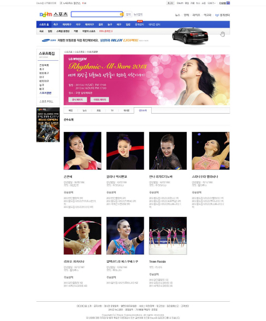 다음커뮤니케이션은 아시아선수권 3관왕에 빛나는 '리듬체조 요정' 손연재와 세계 리듬체조 올스타들이 펼치는 아름다운 리듬체조의 축제, 'LG휘센 리드믹 올스타즈 2013'를 온라인과 모바일에서 생중계한다고 13일 밝혔다.