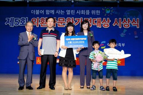 외환은행나눔재단(윤용로 이사장 겸 외환은행장/www.kebfoundation.org)은 지난 12일 화목하고 모범적인 다문화가정 주부와 역경을 극복해가는 다문화가정주부 및 다문화가정을 지원하는 개인과 단체를 선발·시상하는 '제5회 외환다문화가정대상' 시상식을 조윤선 여성가족부 장관, 이자스민 국회의원 등 다수의 내외빈이 참석한 가운데 외환은행 본점 대강당에서 가졌다고 13일 밝혔다.