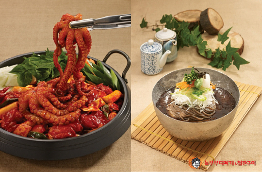 국물 없이 깔끔하게 즐기는 '낙지닭갈비철판구이'는 쫄깃한 낙지와 담백한 닭갈비를 한 번에 맛 볼 수 있는 메뉴다. 놀부 특제 매콤달콤한 소스가 매우면서도 감질 맛을 내 여름철 무더위를 잊게 한다. 낙지닭갈비세트메뉴를 이용하면 낙지닭갈비 2인분과 면사리, 산사춘 1병을 2만7000원에 알뜰히 즐길 수 있다. 우리나라 대표 보양식품인 낙지를 좀 더 풍성하게 즐길 수 있는 '낙지철판구이', 소시지, 오리, 베이컨 등 다양한 재료가 푸짐하게 들어간 '모둠 철판구이'도 출시했다.