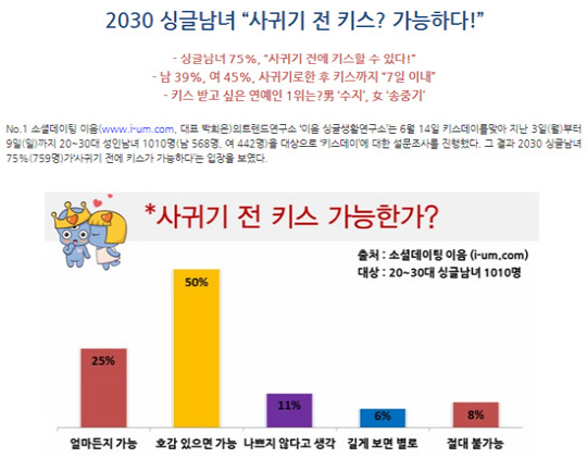 키스데이 설문, 싱글男女 75% “사귀기 전 키스 가능”
