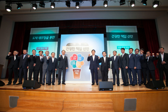 하나금융그룹 김정태 회장은 기조 연설에서 생활 속에서 실천할 도덕의 황금률로 '자신이 대접받고 싶은대로 남을 대하는 것'을 제시하고, "하나금융그룹 임직원부터 가장 기본적인 도덕재무장을 통해 사회 전체가 건강하게 될 수 있도록 밑거름이 되자" 라고 말했다. [소비자인사이트/스포츠조선] 송진현 기자 jhsong@sportschosun.com