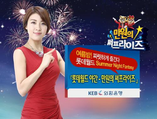 외환은행(은행장 윤용로)은 "Summer Night Fantasy"라는 테마로 '롯데월드 야간- 만원의 써프라이즈'행사를 6월 22일부터 7월 28일까지 진행한다고 20일 밝혔다.